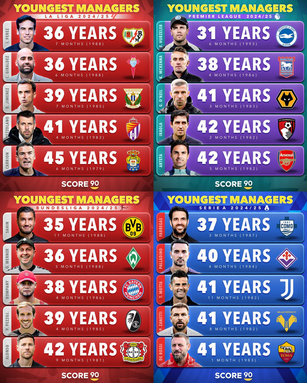 Najmłodsi trenerzy w LaLidze, Premier League, Bundeslidze i Serie A