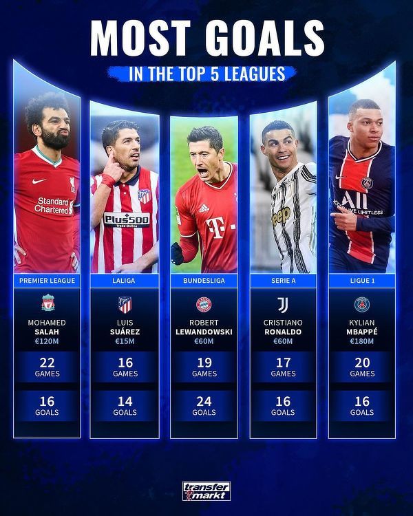 Najwięcej goli w 5 najsilniejszych ligach