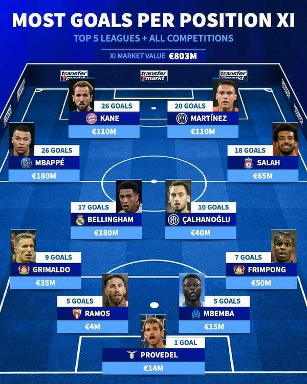 Najwięcej strzelonych goli na danej pozycji z Top5