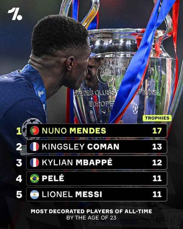 Najwięcej trofeów w wieku 23 lat. Nuno Mendes liderem