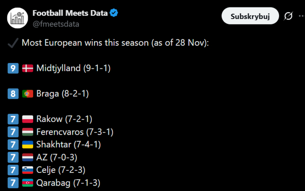 Najwięcej zwycięstw w tym sezonie w europejskich pucharach. Raków w czołówce!