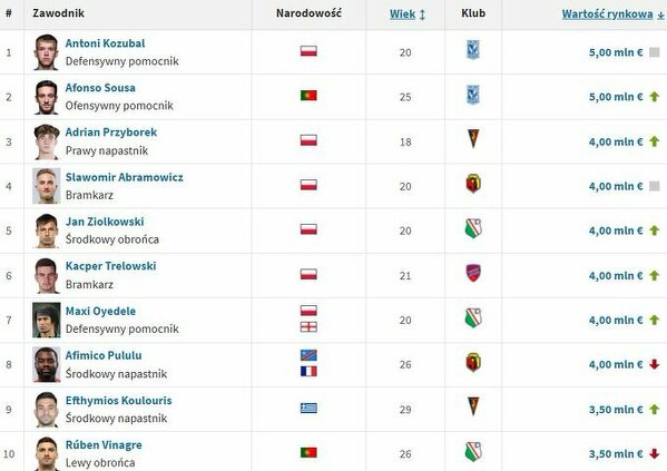 Najwyżej wyceniani piłkarze Ekstraklasy według najnowszej aktualizacji wycen na portalu Transfermarkt