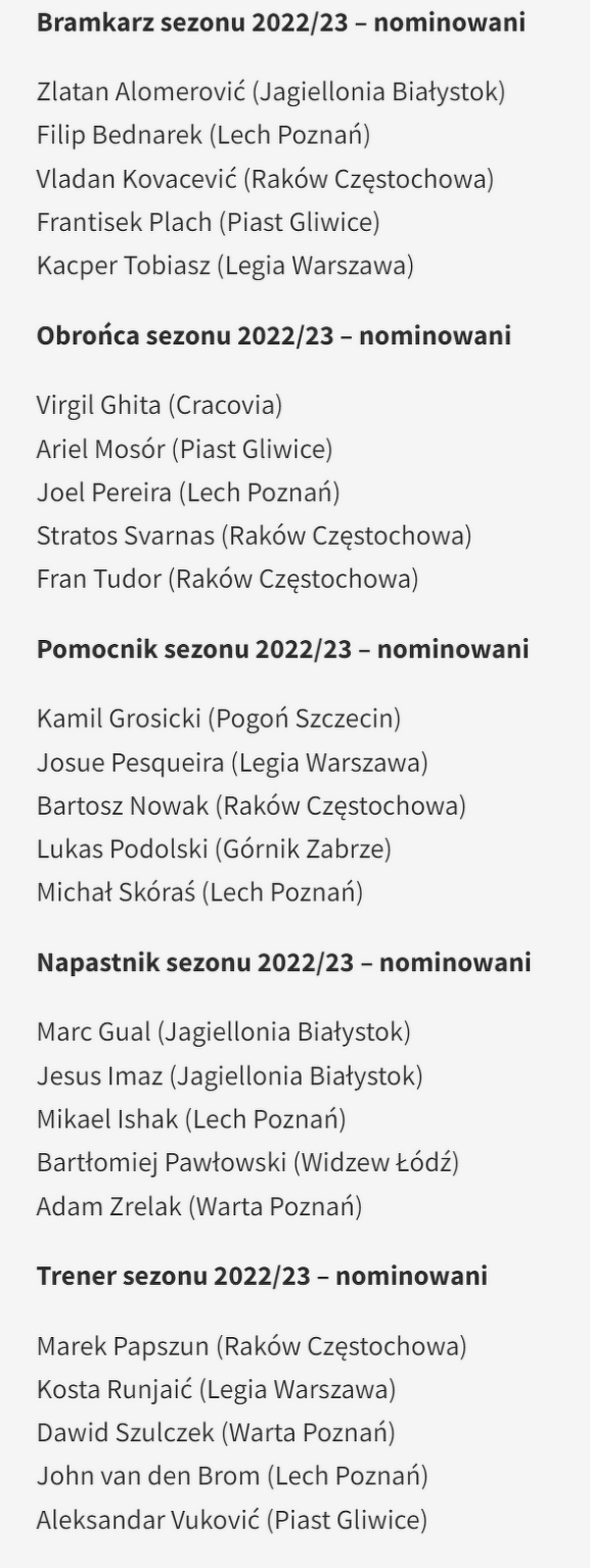 Nominowani do nagród za sezon 2022/2023 PKO Bank Polski Ekstraklasy