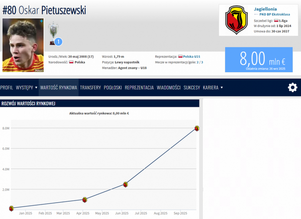 Nowe wyceny na portalu Transfermarkt. Oskar Pietuszewski najwyżej wycenianym piłkarzem z Ekstraklasy