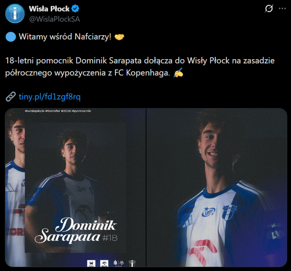 Oficjalnie: Dominik Sarapata został wypożyczony z FC Kopenhaga do Wisły Płock