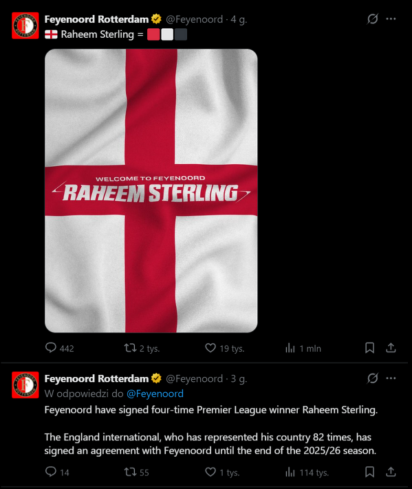 Oficjalnie: Sterling podpisał kontrakt z Feyenoordem do końca sezonu 2025/26