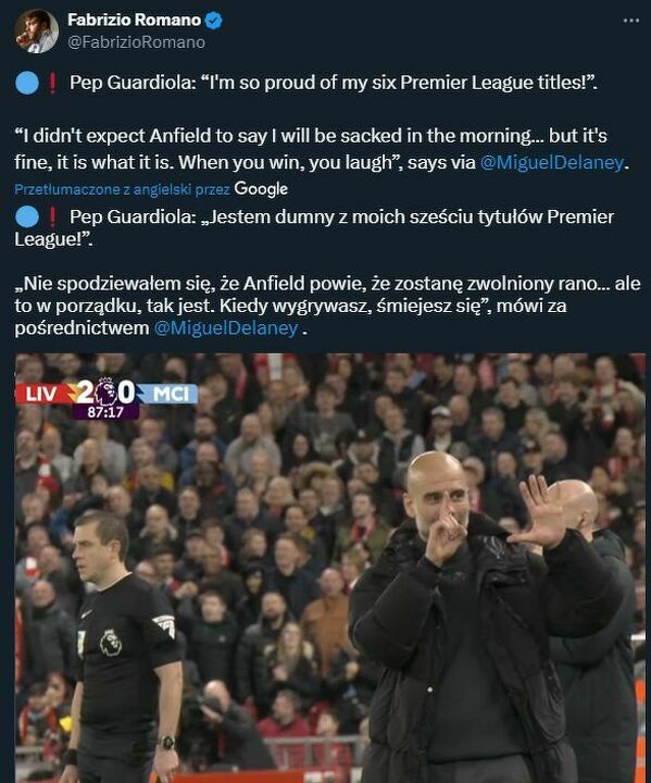 Pep Guardiola po porażce z Liverpoolem