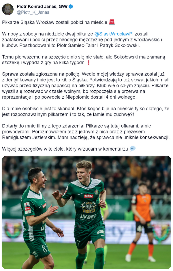 Piłkarze Śląska Wrocław zostali pobici na mieście