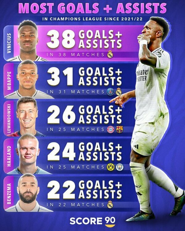 Piłkarze z największą łączną liczbą goli i asyst w LM od sezonu 2021/22