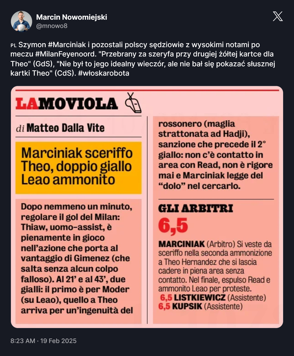Polscy sędziowie wysoko ocenieni po meczu Milan - Feyenoord