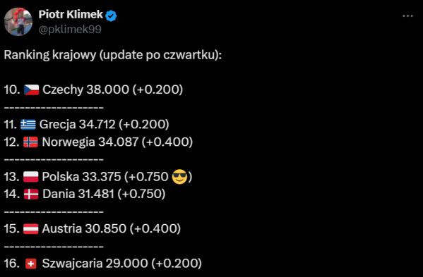 Polska zdobyła kolejne punkty w rankingu krajowym