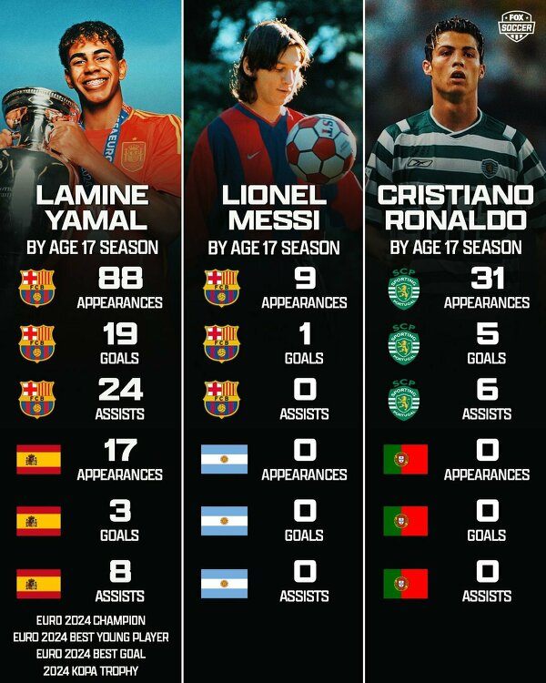 Porównanie Lamine'a Yamala z Messim i Ronaldo w tym samym wieku