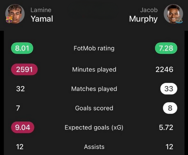 Porównanie statystyk Lamine'a Yamala i Jacoba Murphy'ego