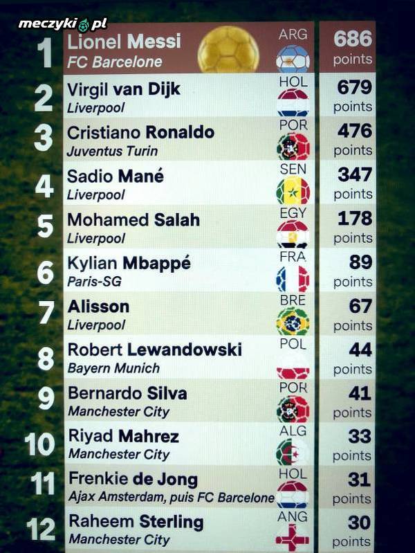 Punktacja czołówki klasyfikacji Złotej Piłki