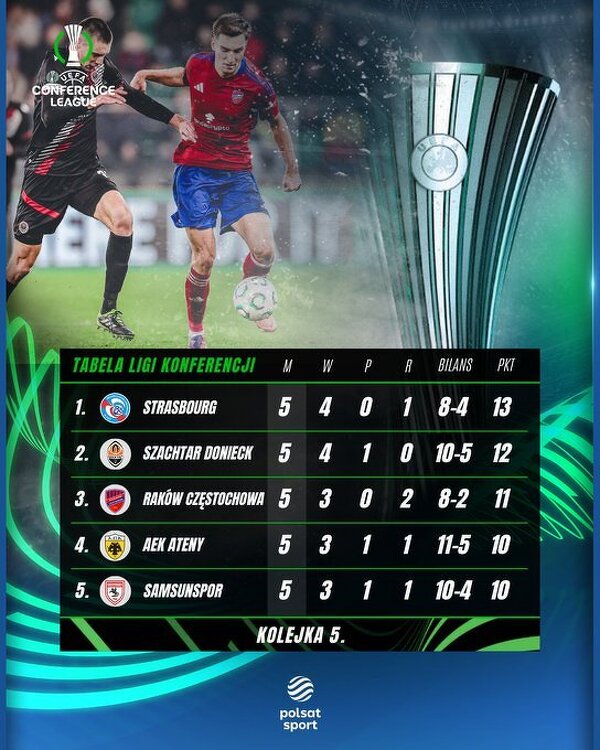 Raków Częstochowa zajmuje obecnie 3. miejsce w tabeli Ligi Konferencji