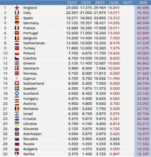 Ranking krajowy UEFA za ostatnie cztery sezony