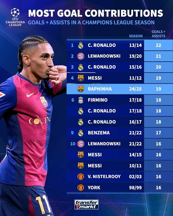 Raphinha może pobić rekord Cristiano Ronaldo w łącznej liczbie goli i asyst w jednym sezonie Ligi Mistrzów