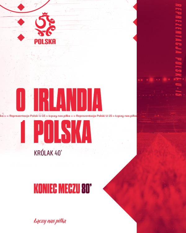 Reprezentacja Polski U-15 wygrała 1:0 z Irlandią po golu Szymona Królaka.