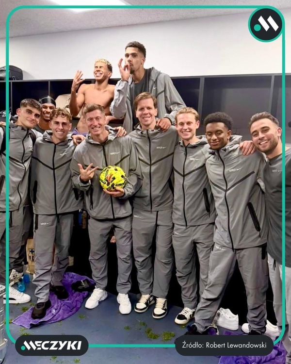 Robert Lewandowski, kumple i podpisana piłka po zdobyciu hat-tricka