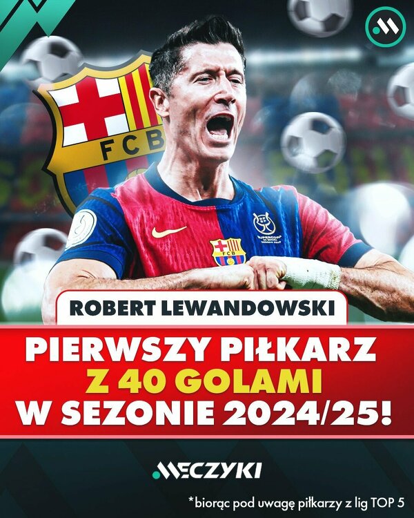 Robert Lewandowski pierwszym piłkarzem z lig TOP 5, który strzelił w tym sezonie 40 goli (dla klubu i reprezentacji).