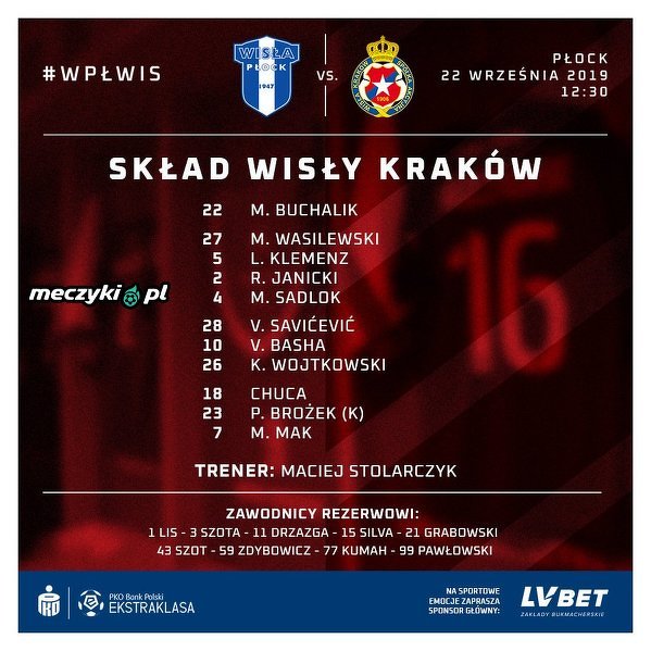 Skład Wisły Kraków na mecz z Wisłą Płock