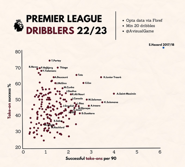 Statystyka dryblerów obecnego sezonu Premier League z Edenem Hazardem 2017/18 (6.1 dryblingu na mecz przy 83% skuteczności)