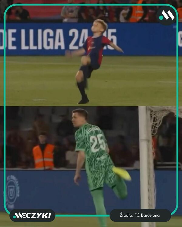 Syn Wojciecha Szczęsnego strzela przewrotką podczas fetowania mistrzostwa Hiszpanii przez Barcelonę, a tata broni piętą