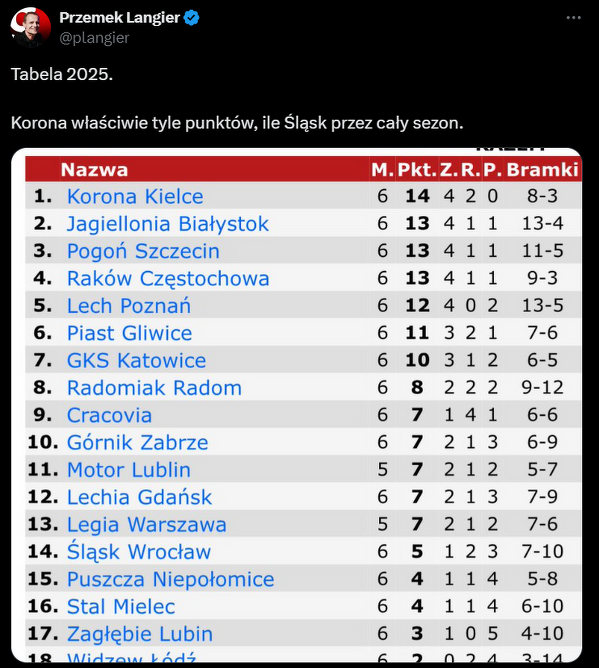 Tabela Ekstraklasy tylko za ten rok