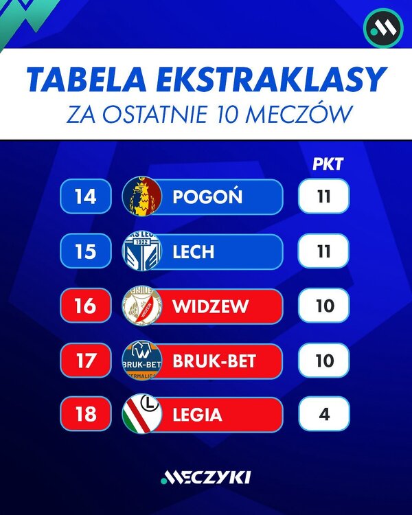 Tabela Ekstraklasy za ostatnie 10 meczów
