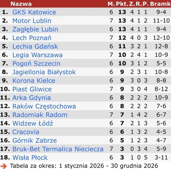 Tabela Ekstraklasy za ten rok