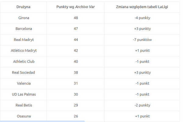 tabela La Liga, gdyby nie było " błędów" sędziowskich