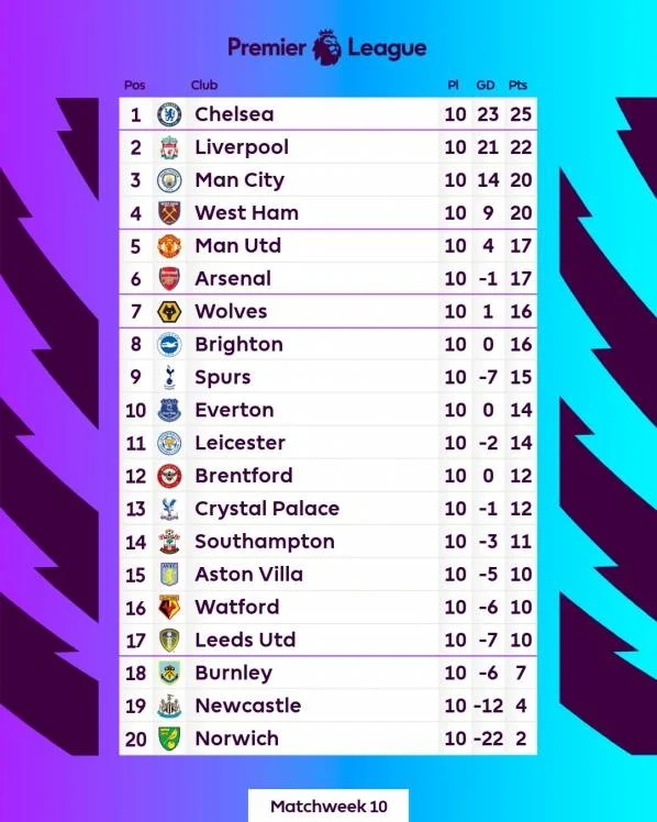 Tabela Premier League po 10. kolejkach