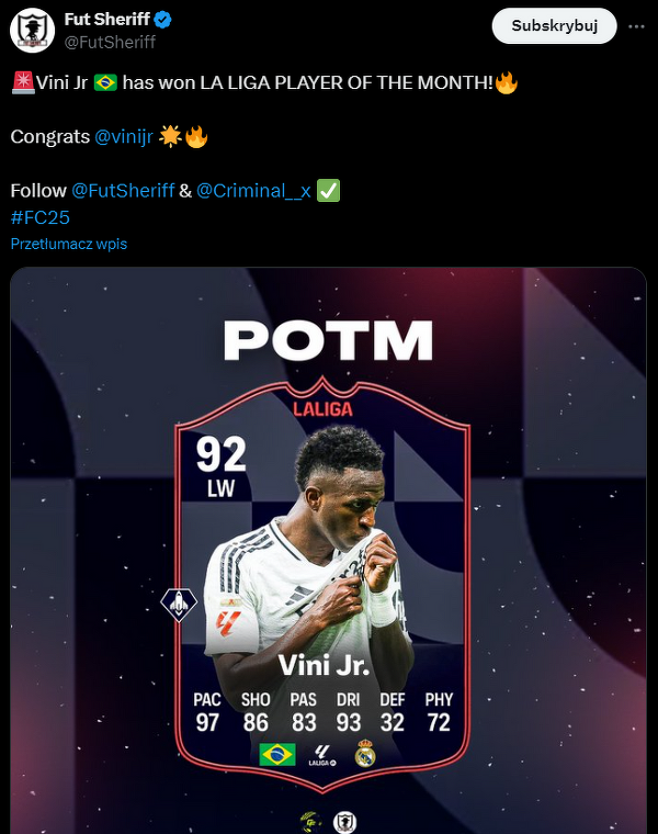 Tak ma wyglądać karta POTM Viniciusa w EA FC 25