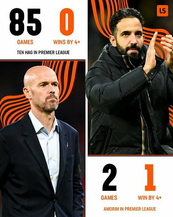 Ten Hag jako trener Man Utd nigdy nie wygrał w lidze co najmniej czterema bramkami. Amorim ma już jedno takie zwycięstwo