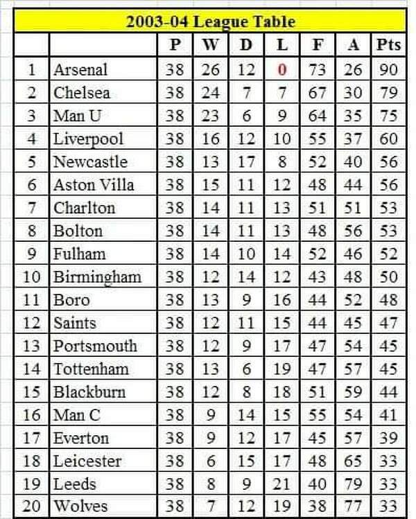 To był ostatni sezon kiedy Arsenal uzbierał przynajmniej 90 punktów w Premier League.