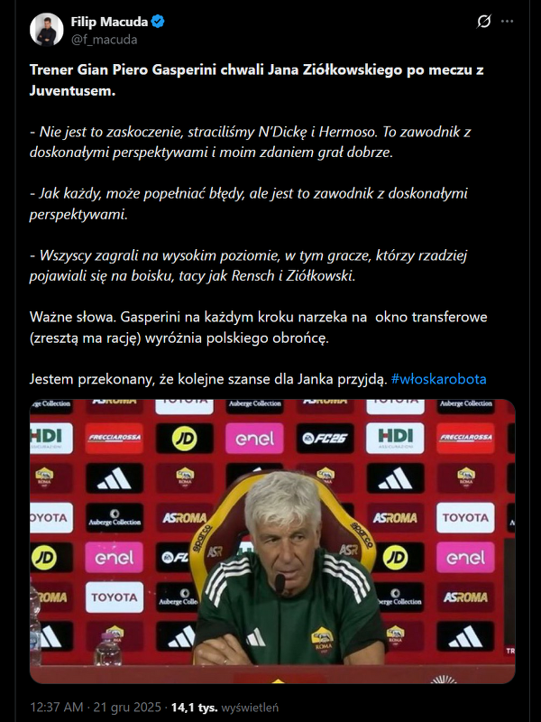 Trener Romy chwali Jana Ziółkowskiego po meczu z Juventusem