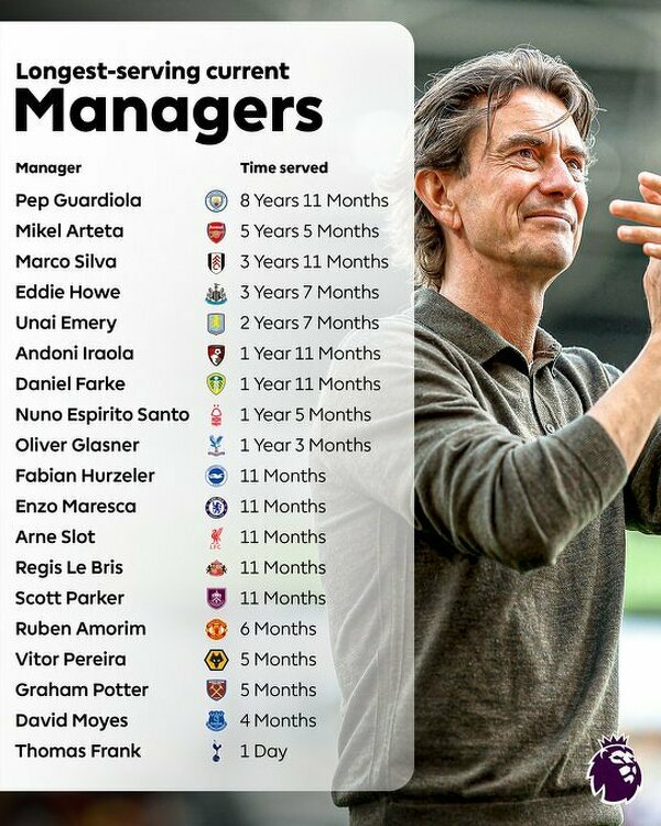 Trenerzy z najdłużej stażem w jednym klubie Premier League (stan na 12 czerwca)