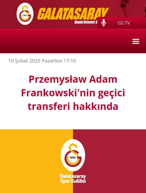Tymczasem oficjalny serwis Galatasaray ogłasza wypożyczenie Przemysława Frankowskiego