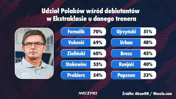 Udział Polaków wśród debiutantów w Ekstraklasie u danego trenera