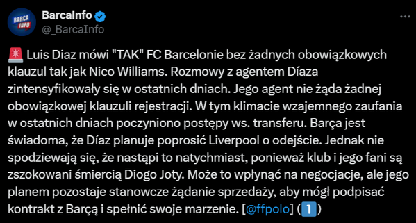 Według "Mundo Deportivo" Barcelona jest coraz bliżej ściągnięcia Luisa Diaza