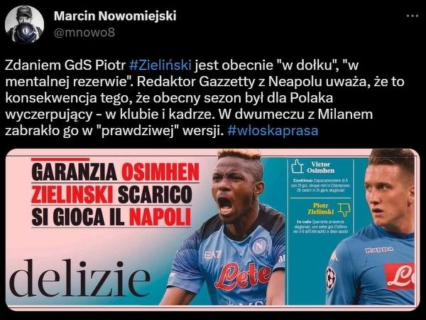 Włoska prasa rozczarowana grą Zielińskiego