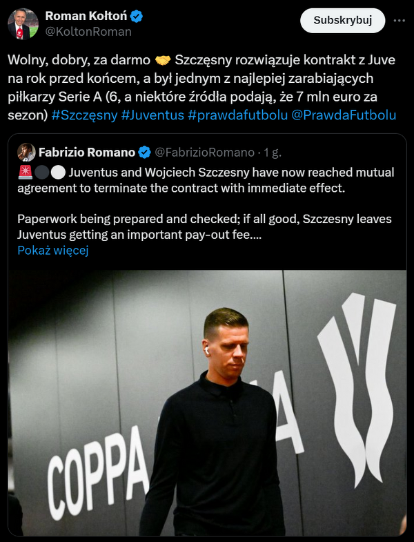Wojciech Szczęsny odchodzi z Juventusu i będzie wolnym zawodnikiem
