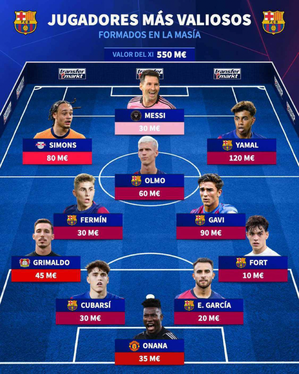 XI złożona z wciąż aktywnych piłkarzy wychowanych w La Masii