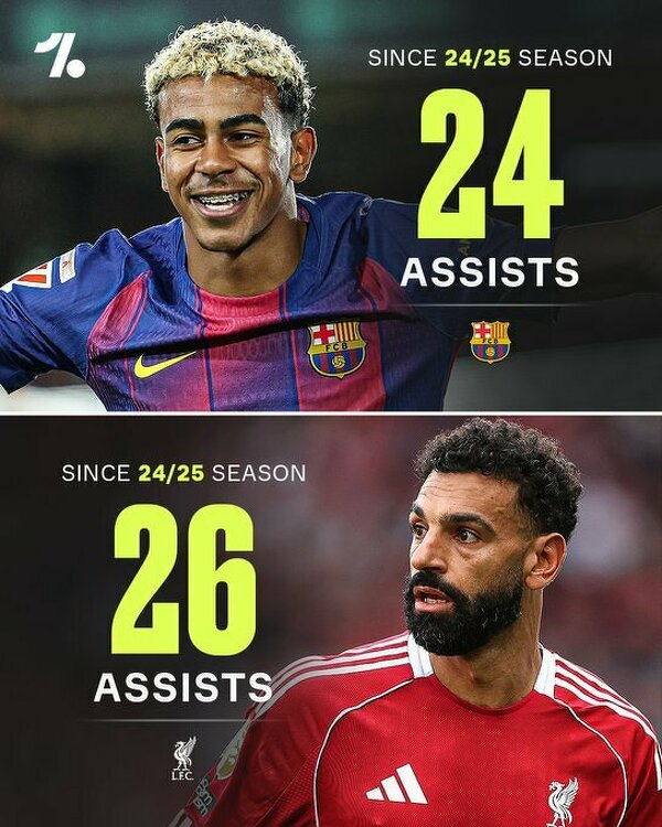 Yamal zaliczył 24 asysty od początku poprzedniego sezonu. Tylko Salah odnotował ich więcej