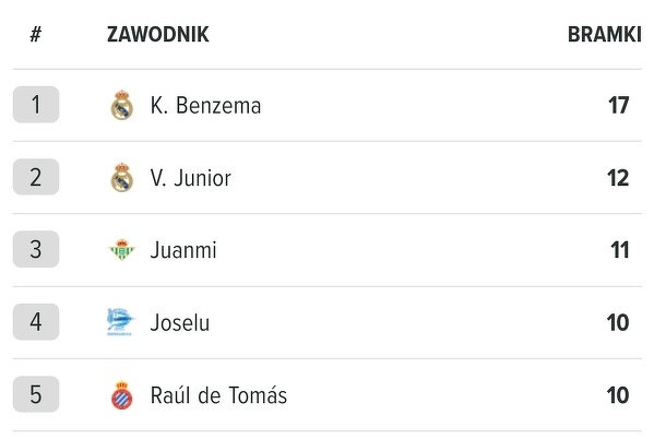 Z TOP 3 KLUBÓW HISZPANII, W TABELI STRZELCÓW SĄ TYLKO PIŁKARZE REALU.