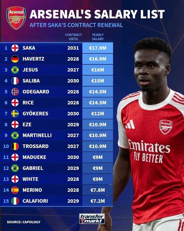Zarobki piłkarzy Arsenalu po przedłużeniu kontraktu Bukayo Saki