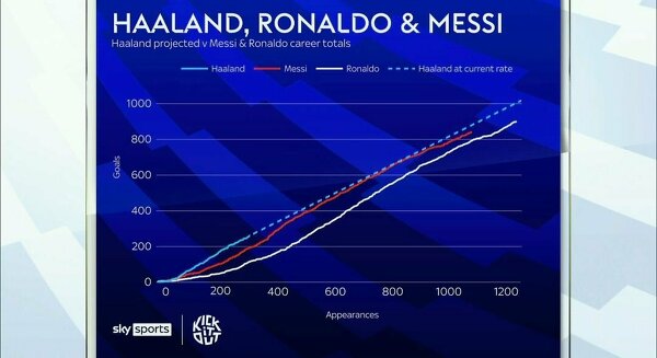 Zdobywane bramki przez Haalanda na tle strzelonych bramek przez Messiego i Ronaldo